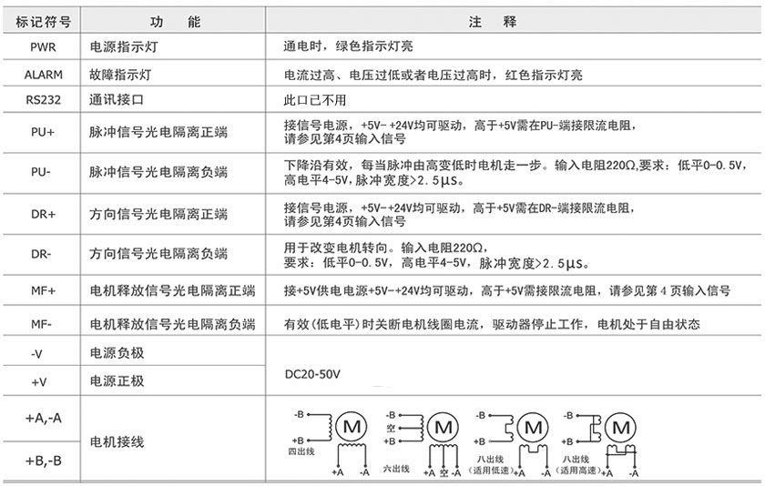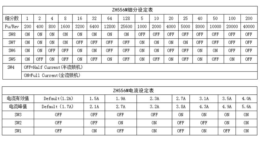 概述 ZH556M 是基于全新一代32位DSP技术的高性能数字式步进驱动器,驱动电压DC20-50V,采用单电源供电。适配电流5.6A 以下,外径42mm、57mm、86mm 的各种型号的两相混合式步进电机。该驱动器在内部采用类似伺服的控制原理,独特的电路设计,优越的软件算法处理,即使在低细分条件下也可以使电机低速运行平稳,几乎没有振动和噪音;平滑、精确的电流控制技术大大减小了电机发热;外置16 档等角度恒力矩细分,最高200 细分;光电隔离差分信号输入,抗干扰能力强;具有过压,欠压,过流保护等出错保护功能;在点胶机、激光雕刻等中、低速应用领域,其平稳性、振动、噪声性能优势明显,可大大提高设备性能。