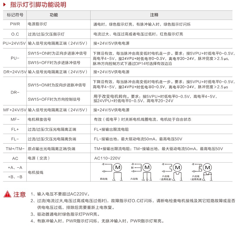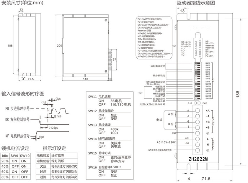 概述 ZH2822M是一款两相高压全数字步进电机驱动器,驱动器内部以DSP作为核心运动控制芯片,FPGA作为辅助元件,算法灵活、先进,采用专用霍尔电流传感器,噪声小、抗干扰性强,强弱电隔离,等特点,产品可靠性高,高速出力好,驱动器可驱动86、110、130、150系列高压电机。