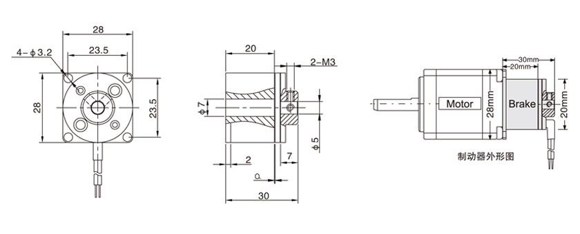 特点 28刹车步进电机,步进、伺服电机专用制动器: 1、失电制动,掉电保护电机及设备的安全; 2、反应时间是普通弹簧压紧电磁制动器的1/10; 3、体积小,保持扭力大,并可线性调节; 4、完全实现高速零损耗静音运行,超长寿命表现; 5、功耗小,热平衡温度低; 6、使用中无需高速气隙,任意角度实现均衡制动; 7、大温度范围内提供稳定的制动扭矩; 8、外形订制,可与电机紧密配成一体; 9、高精度定位步进电机、伺服电机,特别是Z轴运动系统的首选制动单元。