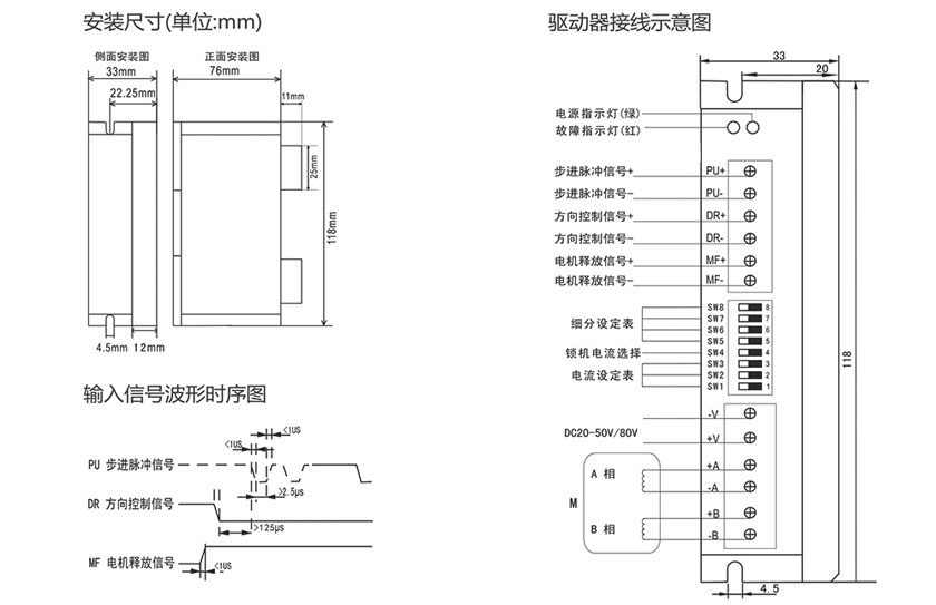 体积非常小巧: ZH556M 是一款经济、小巧的步进驱动器, 尺寸为118x76x33mm(不含端子),净重量为:0.3kg
