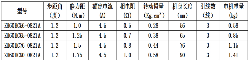 特点 双极性1.2° 机座号:60 保持转矩:1~1.75N.M 输出转矩大,高转速电机发热小,噪音低,效率高 高速停止平稳快速,无零速振荡运行平稳,振动噪声小 响应速度快,适合频繁启停的场合。 技术数据