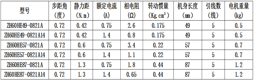 特点 双极性0.72°; 机座号:60; 保持转矩:0.42~1.3N.M; 输出转矩大,高转速;电机发热小,噪音低,效率高; 高速停止平稳快速,无零速振荡运行平稳,振动噪声小; 响应速度快,适合频繁启停的场合。 技术数据